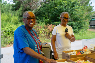 Volunteers preparing to load boxes of food into clients vehicle.