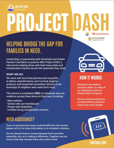 Project DASH is a nationwide initiative powered by DoorDash that helps food banks and nonprofits overcome the “last mile” of food delivery. Through this collaboration, deliveries are currently being made within a 10-mile radius of United Way’s distribution point on Broad Street in Augusta, with plans to expand service to additional communities in the months ahead.