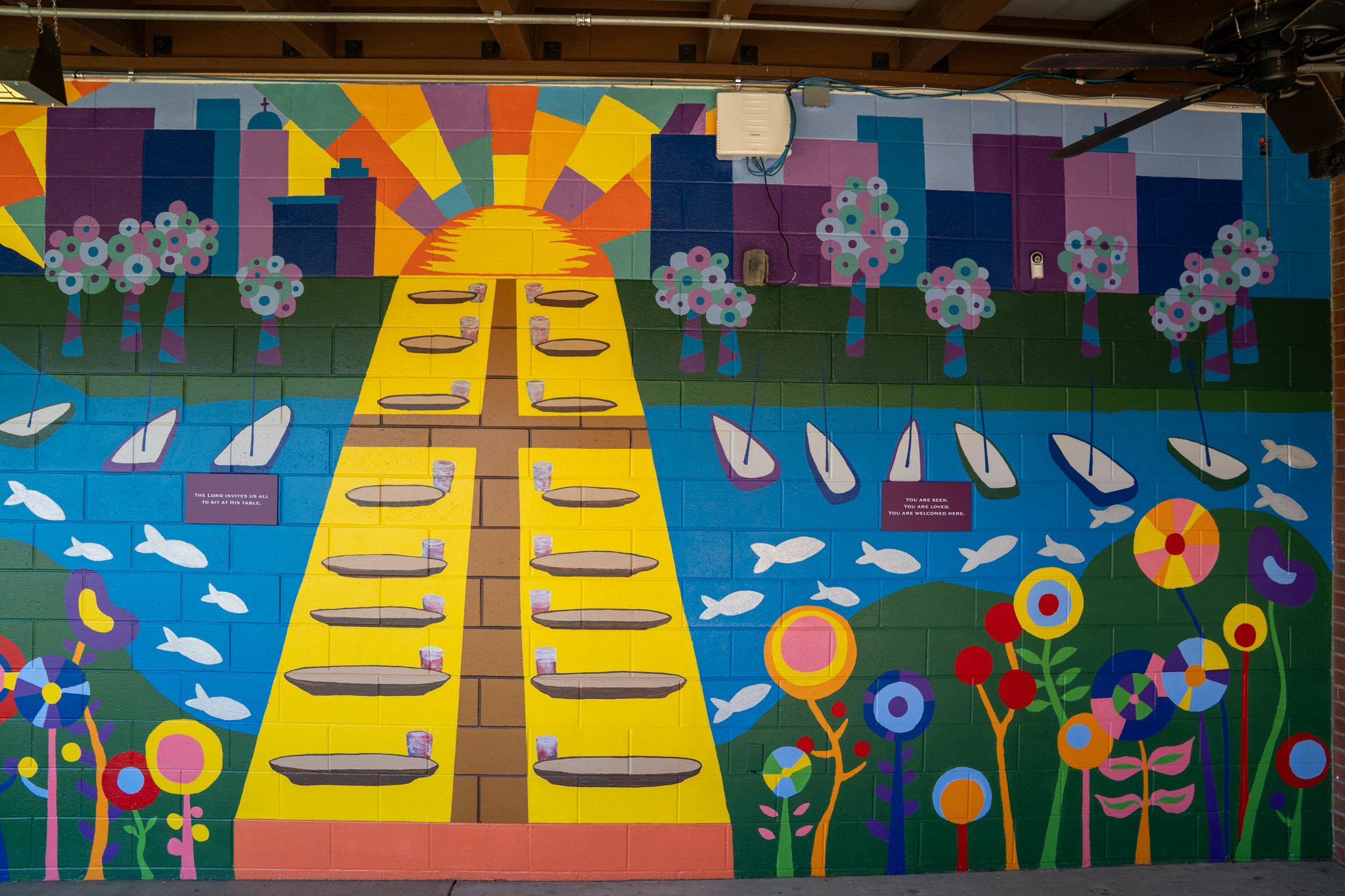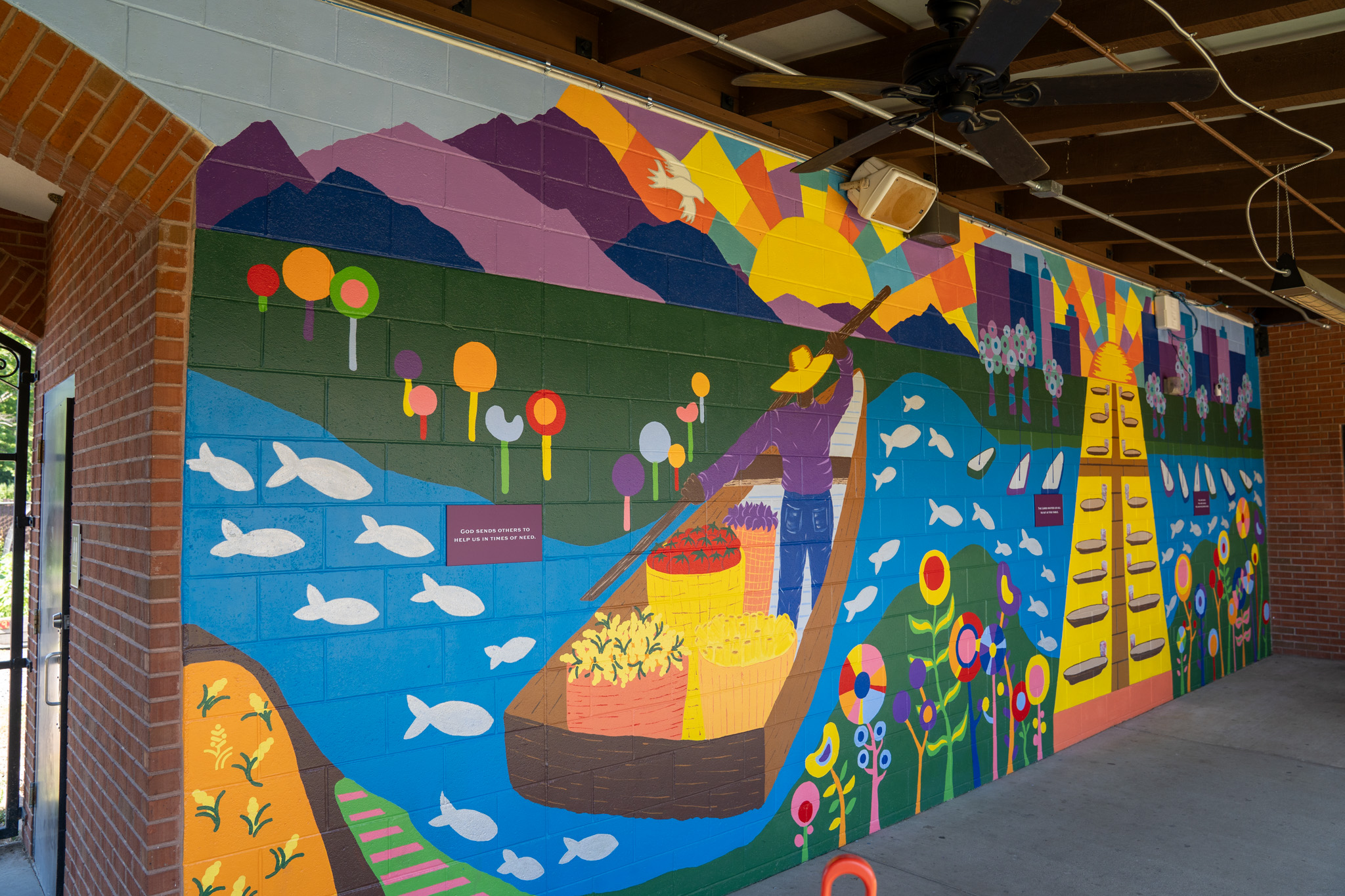 At the center of the mural is a message rooted in God’s love and provision. The hands helping gather wheat, the loaves and fishes, and the bright harvest imagery remind us that food is more than a meal. It is care. It is community. It is one way we reflect Christ’s love to our neighbors.